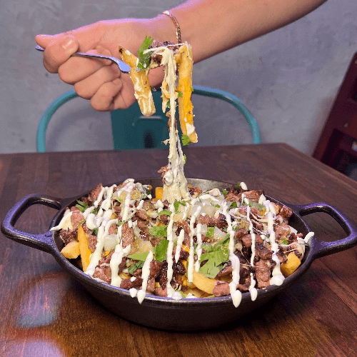 French fries, steak, mozzarella cheese, cheddar cheese, onion, cilantro, sour cream, salsa verde