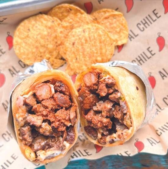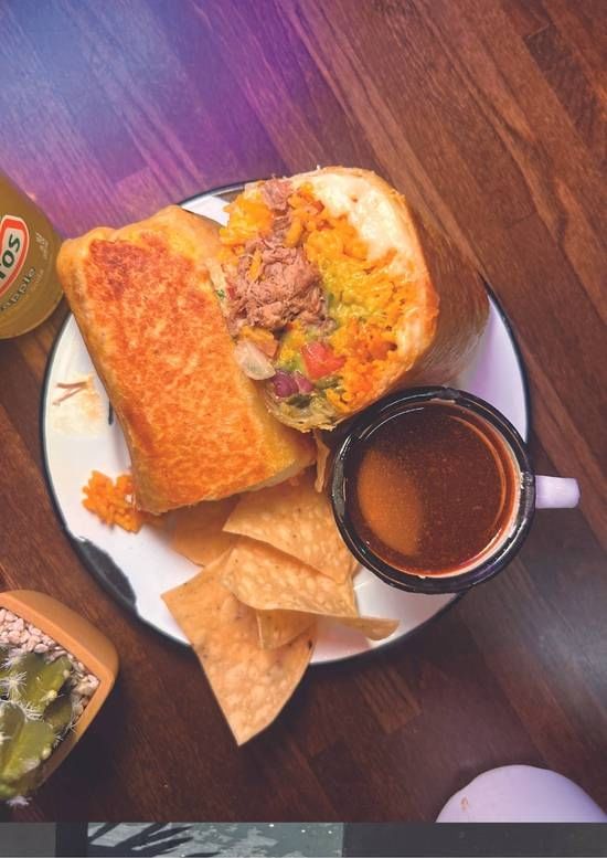 12'' homemade flour tortilla served with protein, rice, pinto beans, pico de gallo, mozzarella cheese, and rajas cream.