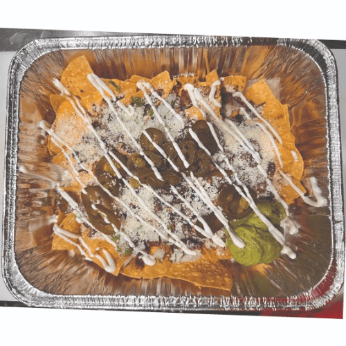 Melted cheddar, cotija cheese, asada, pastor (pork), onion, cilantro, guacamole, jalapenos and sour cream
