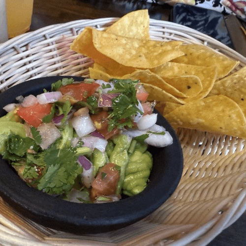 Fried corn tortilla, green sauce or spicy sauce, cheese, Mexican cream onion and cilantro