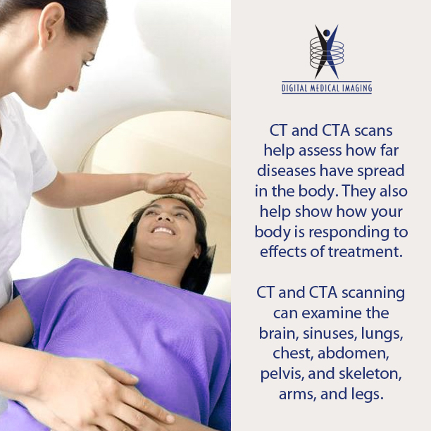 CT and CTA scans help assess how far diseases have spread in the body. They also help show how your body is responding to effects of treatment. CT and CTA scanning can examine the brain, sinuses, lungs, chest, abdomen, pelvis, and skeleton, arms, and legs.